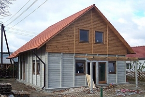 Ausbauhaus mit Profilwandfassade, Pergola, Ziegeldach, Schleppdach